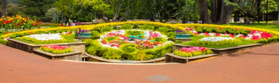 Wir wenden uns nun der Ostseite des Parks zu, wo er von der Princes Street begrenzt wird. Bevor wir ihn dort verlassen, kommen wir an einer Ecke, die von zwei aufeinandertreffenden Wegen gebildet wird, zu einer riesigen Ansammlung von mit kleinen Mauern eingefaßten Blumenrabatten. Während links und rechts niedrige, sorgfältig gestutzte Hecken den Namen der Grünanlage bilden – ALBERT links, PARK rechts – stellen die in bunten Farben blühenden Anpflanzungen in der Mitte ganz offensichtlich eine riesige Uhr dar. Als ich nähertrete, entdecke ich auch die großen Zeiger, die über den Rabatten ihre Bahn ziehen. Unwillkürlich ziehe ich mein Mobiltelefon hervor, um die Zeit zu vergleichen. Tatsächlich, diese riesige Blumenuhr geht absolut genau. Siebzehn Minuten nach Eins. Was für ein wunderschönes gärtnerisches Kunstwerk! Dies ist um so bewundernswerter, als dieser pflanzliche, wenn auch elektrisch betriebene Zeitmesser bereits mehr als sechzig Jahre alt ist. 1953 wurde die Laidlaw Floral Clock geschaffen. Die Familie Laidlaw hatte sie anläßlich des ersten Besuch Königin Elisabeths II. in Neuseeland gestiftet.