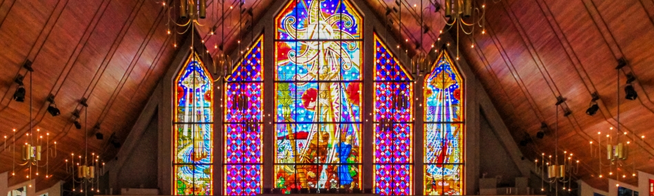 Weil sich an diesem Ende des Kirchenschiffs der Innenraum der Kathedrale auf den schmaleren Chorbereich verengt, befindet sich hinter dem Taufstein nun eine weiße Wand und ich muß zur Mitte des Raumes gehen, um meinen Weg in den Chor fortsetzen zu können. Als ich bei dieser Gelegenheit einen Blick zurück in Richtung des Eingangs und damit der Frontseite der Kathedrale werfe, stockt mir förmlich der Atem. Es ist ein wahrlich erhabener Anblick, der sich meinen Augen bietet! Hatte ich auf dem Vorplatz bei der Betrachtung der Vorderseite der Kirche bereits vermutet, daß das große fünfteilige Fenster über dem Eingang ein Buntglasfenster sein könnte, so finde ich dies nun nicht nur bestätigt, sondern vor meinen Augen entfaltet sich ein beeindruckendes Fenstergemälde. Geschaffen von dem neuseeländischen Maler Nigel Brown, zeigt es in überwältigender Farbenpracht einen riesigen polynesischen Christus, umgeben von reichhaltigen Motiven, die unverkennbar dem pazifischen Raum zuzuordnen sind. Von meinem jetzigen Standort am Ende des Kirchenschiffs aus kann ich dieses monumentale Bild in seiner ganzen Länge überblicken. Die Perspektive ist einmalig! Sämtliche Linien des gefalteten Daches scheinen in ihrer gesamten Länge auf dieses riesige Fensterbild zuzulaufen, ebenso wie die Längsseiten der in Blöcken angeordneten Stuhlreihen am Boden des riesigen Saales, was das Glasgemälde zu dessen alleinigem Blickfang werden läßt, der das Innere der Kathedrale völlig ausfüllt, ohne jedoch niederzudrücken oder zu beherrschen. Eine architektonische und künstlerische Meisterleistung, deren starke Symbolkraft sogar mich religiösen Laien berührt!